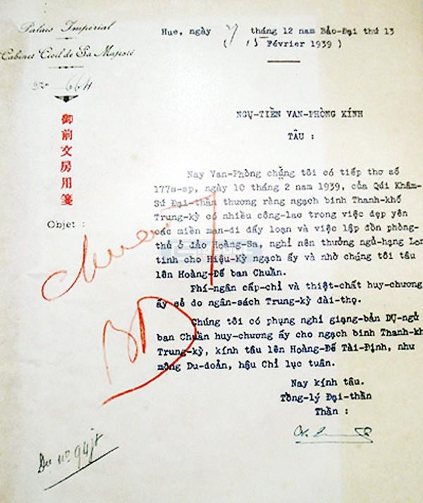 Bản đồ “An Nam Đại Quốc Họa Đồ” do giám mục Taberd (Pháp) lập và xuất bản năm 1838 đã vẽ rất chính xác về tọa độ Paracel hay Hoàng Sa của Việt Nam.Bản đồ Châu Á thế kỷ XVII vẽ một phần của “Paracel” hay “bãi cát vàng” khu vực quần đảo Hoàng Sa của Việt Nam hiện nay.Bản đồ các đài khí tượng Đông Dương, 1940. Đài Pattle (Hoàng Sa) và đài ở Ita Aba (Trường Sa) là hai đài khí tượng cấp quan trọng nhất của Việt Nam.Bản đồ Tonquin (Miền Bắc Việt Nam), 1682 do Daniel Tavernier vẽ trong những năm 1640 khi ông làm thư ký cho Công ty Đông Ấn Hà Lan ở Đàng Ngoài.Bản đổ vùng Viễn Đông, Brion de la Tour, 1774. Trên bản đồ vẽ quần đảo Paracel (Hoàng Sa) thuộc lãnh thổ Đàng Trong, Đại Việt.Một tờ châu bản triều Nguyễn, Bảo Đại năm thứ 13 (1939) liên quan đến đảo Hoàng Sa“Đại Nam nhất thống toàn đồ” đầu thế kỷ XIX. Đây là bản đồ nước Việt Nam thời nhà Nguyễn vẽ khoảng năm 1834, trên bản đồ có ghi 2 tên Hoàng Sa và vạn lý Trường Sa thuộc lãnh thổ Việt Nam. The Paracel and Spratly Islands have been subject to the sovereignty of Viet Nam by reason of terra nullius (land not belonging to any sovereign State) effectively occupied by Viet Nam since the 16th century4 trang Phủ Biên tạp lục, Lê Quý Đôn, 1776 , chép về việc thành lập và tổ chức hoạt động của Hải đội Hoàng Sa, Hải đội Bắc Hải. Viet Nam uses official documents from the 17th century to support these arguments. These include Đại Nam thực lục tiền biên (1600–1775) (大南實錄前編, The Early Chapter of The Chronicles of Đại Nam [Đại Nam is an ancient name of Vietnam]), Toản tập Thiên Nam tứ chí lộ đồ thư (1630–1653) (纂集天南四至路图書, The Collection of the South’s Road Map), Phủ biên tạp lục (1776) (撫邊雜錄, Miscellany on the Pacification at the Frontier), Đại Nam thực lục chính biên (1848) (大南實錄正編, The Main Chapter of The Chronicles of Đại Nam), Đại Nam nhất thống chí–the combinatorial record for geography and history of Đại Nam (1865–1882) (大南ー統誌, The Record of The Unified Đại Nam), Hoàng Việt dư địa chí (1833) (皇越輿地誌, Geography of The Viet Empire), Việt sử thông giám cương mục khảo lược (1876) (越史通鑑綱目考略, Outline of The Chronicles of The Viet History), official documents of the Nguyễn Dynasty on petitions and imperial decrees, and many maps and documents made by other countries at that time2. Jaseniew Vladimir and Stephanow Evginii, in their 1982 book entitled “The Chinese Frontiers: From Traditional Expansionism to Present Hegemonism”, listed the activities of the Vietnamese States in continuously exercising their sovereignty over the Paracel and Spratly Islands, and emphasized that “feudal States of Viet Nam had for long annexed archipelagos such as the Paracels and Spratlys into their State’s territory”3.Thuyền buồm của Hải đội Hoàng Sa thời nhà Nguyễn Thuyền buồm của Hải đội Hoàng Sa thời nhà Nguyễn sau khi được phục dựngThe States of Viet Nam knew of the Paracel and Spratly Islands, grouped them together, named them as “Đại Trường Sa” (Hán-Nôm: 大長沙; English: Grand Long Sand), “Hoàng Sa” (黃沙, Yellow Sand), or “Vạn Lý Trường Sa” (萬里長沙, Ten-Thousand-Mile Long Sand), and considered them as part of Viet Nam’s territory.Throughout more than three hundred years, from the 16th to the 19th centuries, the States of Viet Nam had continuously exercised their sovereignty at least over the Paracel Islands by frequently sending the Flotillas of Hoàng Sa and Bắc Hải to the archipelago, which would stay there for several months every year for surveying and exploiting resources in a systematic manner. Personnel from these flotillas collected goods from wrecked ships, built temples, planted trees to symbolize the State’s sovereignty, collected taxes, and provided assistance to foreign ships in danger. These activities of the Vietnamese States were totally free from any opposition or disputes from other countries, including China, and contained both the corpus and animus elements of an actual possession.The sovereignty stele built on Hoang Sa in March 1938 by Vietnamese guards.The birth certificate of Mrs Mai Kim Quy, the daughter of Mr. Mai Xuan Tap, a meteorological staff on Hoang Sa, granted by the French government in 1940.Vietnamese soldiers dug wells for fresh water on Hoang Sa in 1938. In addition to maps, precious materials, the organizers also display snails, corals and sand collected from Hoang Sa and Truong Sa by fishermen.The valuable document about Hoang Sa which was donated to the Ministry of Foreign Affairs in April 2009 by the Dang family on Ly Son Island, Quang Ngai province. The document was preserved by the six generations. This is the mission order by Quang Ngai’s feudal authorities sending three boats with 24 soldiers to guard Hoang Sa in 1834. The order consists of four pages.This ancient book clearly wrote that King Minh Mang assigned Mr. Pham Huu Nhat to take his soldiers to Hoang Sa to build sovereignty landmarks in 1836.