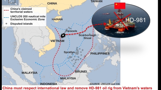 May 22, 2014Re.: China’s Placement of Oil Rig HD-981 in Vietnam’s Exclusive Economic ZoneAs you know, over the years China has been using the unfounded nine-dashed line to claim ownership of the entire Southeast Asia Sea (South China Sea). This nine-dashed line, according to experts throughout the world, has no legal basis whatsoever. Nevertheless, China has been using that nine-dashed line to harass smaller countries in the region, especially the Philippines and Vietnam, in disregard of international law and world opinion.