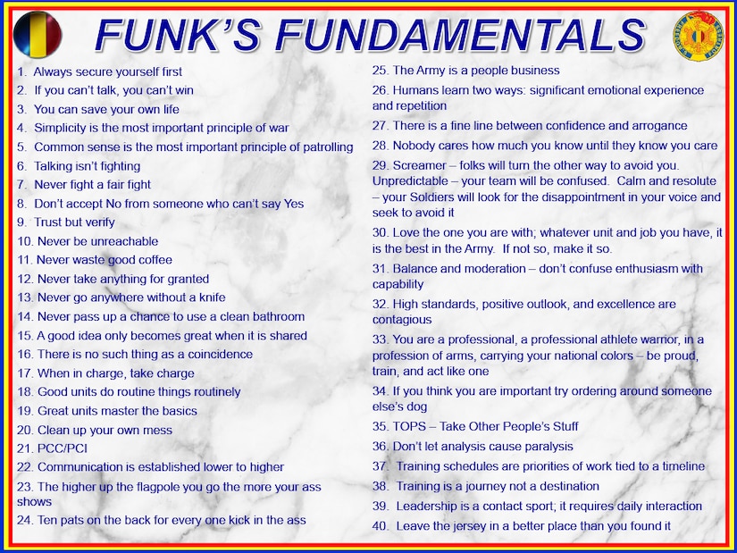 Funk’s Fundamentals are intended to boost morale and inspire. Pulling these lessons from other people or stories he’s heard, these practical ideas continue to shape his personal leadership philosophy.