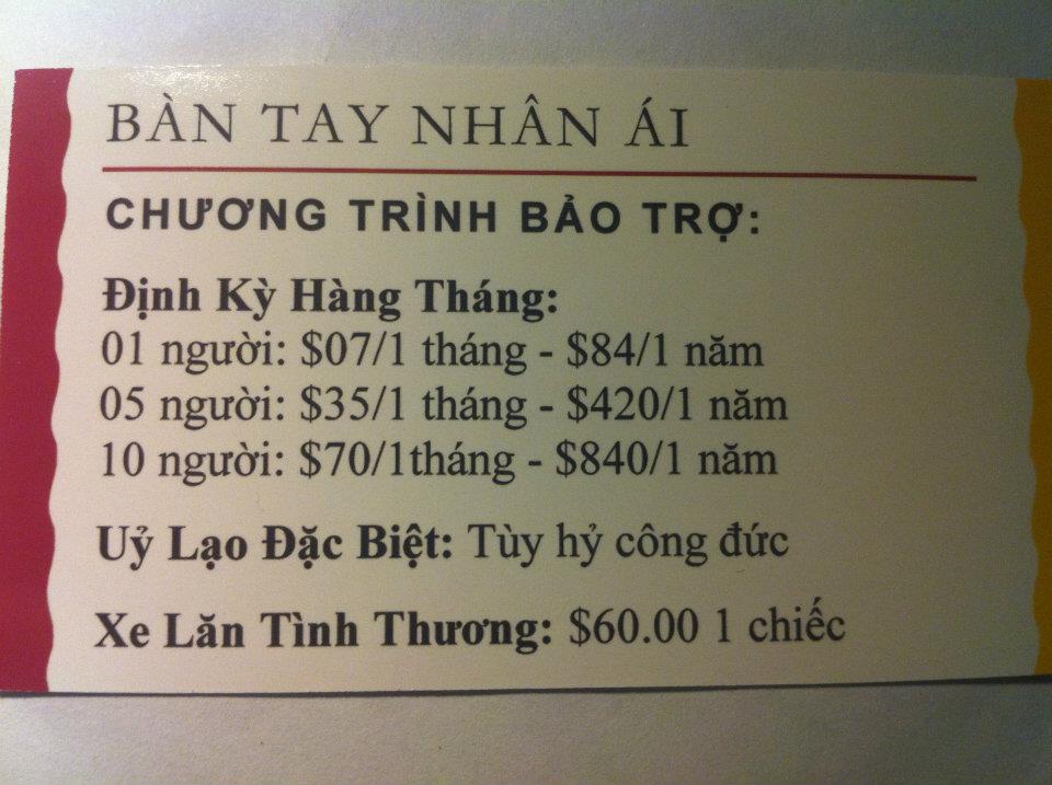 CHƯƠNG TRÌNH PHÁT GẠO ĐỊNH KỲ HÀNG THÁNG Chương trình này nhằm trợ giúp cho những người già yếu mu loa không nơi nương tựa, người bị bệnh tâm thần, người cơ nhỡ không có thân nhân nuôi dưỡng phải sống nhờ vào sự giúp đở của người khác hoặc bà con hàng xóm, tuy vậy phải lăn lộn để kiếm sống từng ngày, có người phải đi ăn xin mong được sự bố thí của kẻ qua đường, đi hái-lượm những đồ ăn, rau quả thừa để ăn qua bữa …Những người này thật sự rất cần một bữa cơm đơn sơ, đạm bạc để họ có thể sinh sống. 10 kg gạo là tiêu chuẩn tối thiểu mà Hội Bàn Tay Nhân Ái hổ trợ cho họ hàng tháng để họ không lo lắng nhiều về cái ăn hàng ngày. Chỉ cần $7.00(USD) là quý vị có thể giúp được 1 người có 10 ký gạo để ăn trong 1 tháng. Chúng tôi xin kêu gọi những nhà hảo tâm, những tấm lòng từ ái, hãy bảo trợ cho những hoàn cảnh kém may mắn này. Quý vị muốn bảo trợ bao nhiêu người cũng tốt, và có thể tài trợ từng tháng, nhiều tháng hay cho trọn năm. Chân thành cảm ơn công đức và sự phát tâm của quý vị. HỘI TỪ THIỆN BÀN TAY NHÂN ÁI Add: 10510 Chapman Ave. Garden Grove, CA 92840 Cell: 714.457.0451 – Chùa: 714.636.6216, Fax: 714.636.6227
