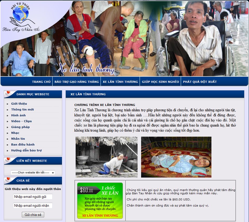 The main needs for most people with physical disabilities are housing and help with daily living. Thus, many of them will find the new emphasis on social aspects of community care particularly relevant It is the mission of Ban Tay Nhan Ai Non- Organization to provide quality and effective individualized services to developmentally disabled children and adults in Vietnam. The services are primarily geared toward helping families cope with the stress of caring for their disabled loved ones.CHƯƠNG TRÌNH XE LĂN TÌNH THƯƠNG là chương trình nhằm trợ giúp phương tiện di chuyển, đi lại cho những người tàn tật, khuyết tật. người bại liệt, bại não bẩm sinh ….Hầu hết những người này đều không thể đi đứng được, cuộc sống của họ quanh quẩn chỉ là cái nhà và cái giường là chổ họ gắn chặt cuộc đời họ vào đó. Một chiếc xe lăn là phương tiện giúp họ đi ra ngòai để được ngắm nhìn thế giới bao la chung quanh họ, hít thở không khí trong lành, giúp họ có thêm ý chí và hy vọng vào cuộc sống tốt đẹp hơn. http://bantaynhanai.org or https://www.facebook.com/BanTayNhanAiCharity/photos_stream?tab=photos_albums